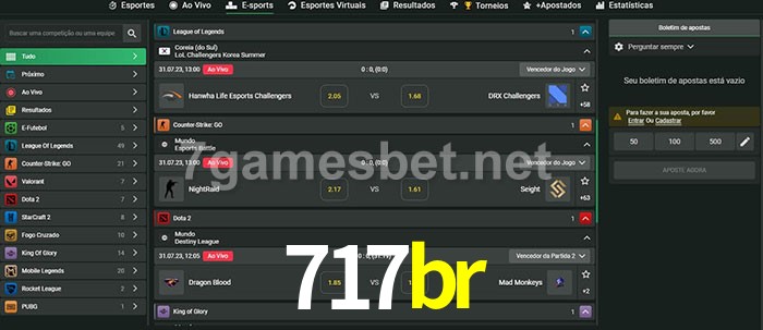 O 717br oferece uma grande seleção de opções de apostas em e-sports com probabilidades competitivas